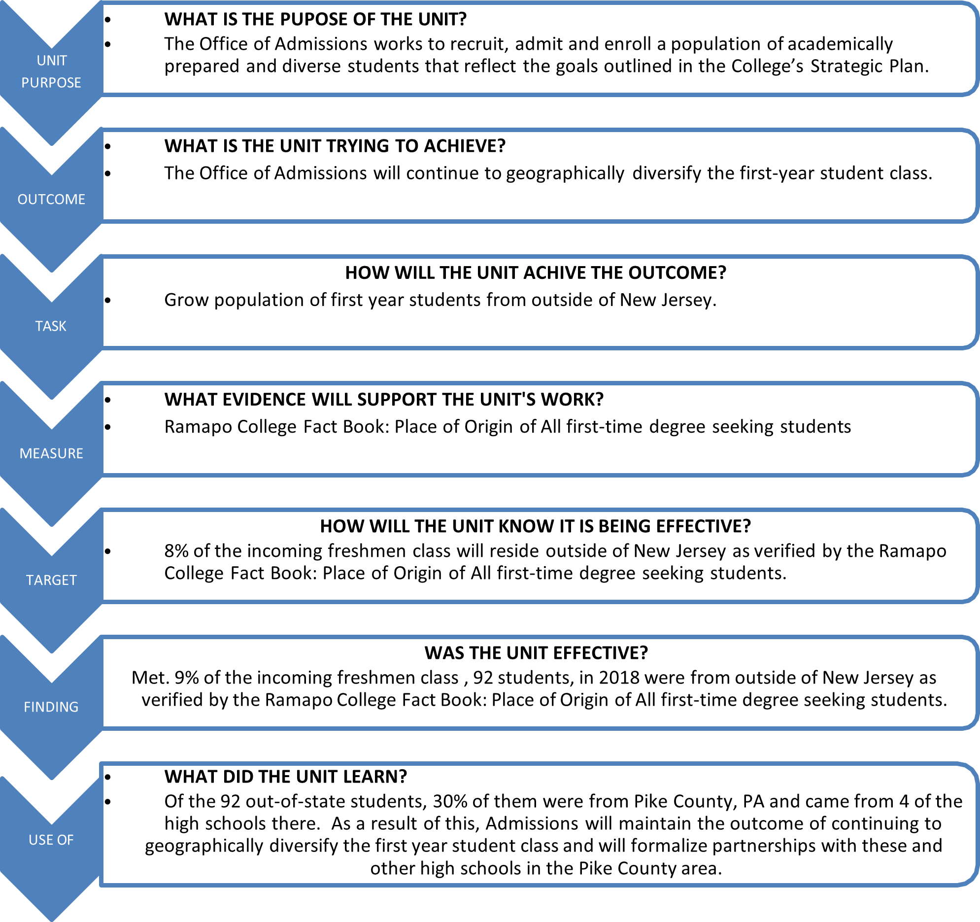 EXAMPLE: Of the 92 out-of-state students, 30% of them were from Pike County, PA and came from 4 of the high schools there. As a result of this, Admissions will maintain the outcome of continuing to geographically diversify the first year student class and will formalize partnerships with these and other high schools in the Pike County area.