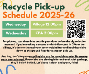 - CPA- Residents are required to sort their trash and recycling. Trash is self-deposited on a regular basis into outdoor collection areas throughout the parking lots. Recycling is also be self-deposited (not in a bag) into an outdoor collection area in the parking lots into recycle sheds, or picked up by a student team, schedule will be distributed by your Hall Office, see above.