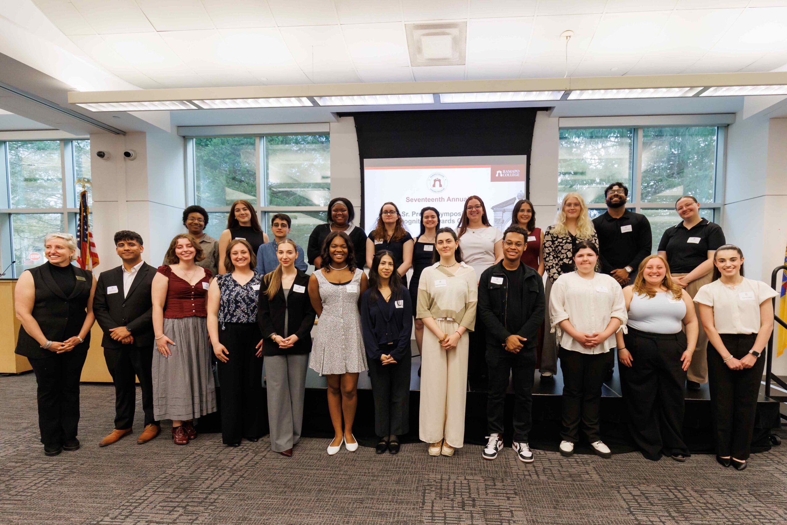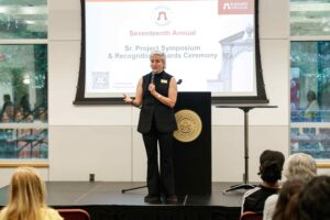 On April 17, 2024, Dr. Erin Augis, College Honors Program Director welcomed approximately 150 attendees to the 2024 Sr. Project Symposium, a didactic celebratory event. The senior Honors Program students proudly presented their research findings by means of posters and oral presentations to their faculty mentors, college executives, faculty, staff, family and friends.