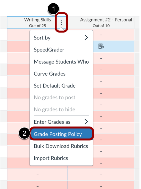 In the Gradebook, click the desired assignment Options [1], then click the Grade Posting Policy link [2].