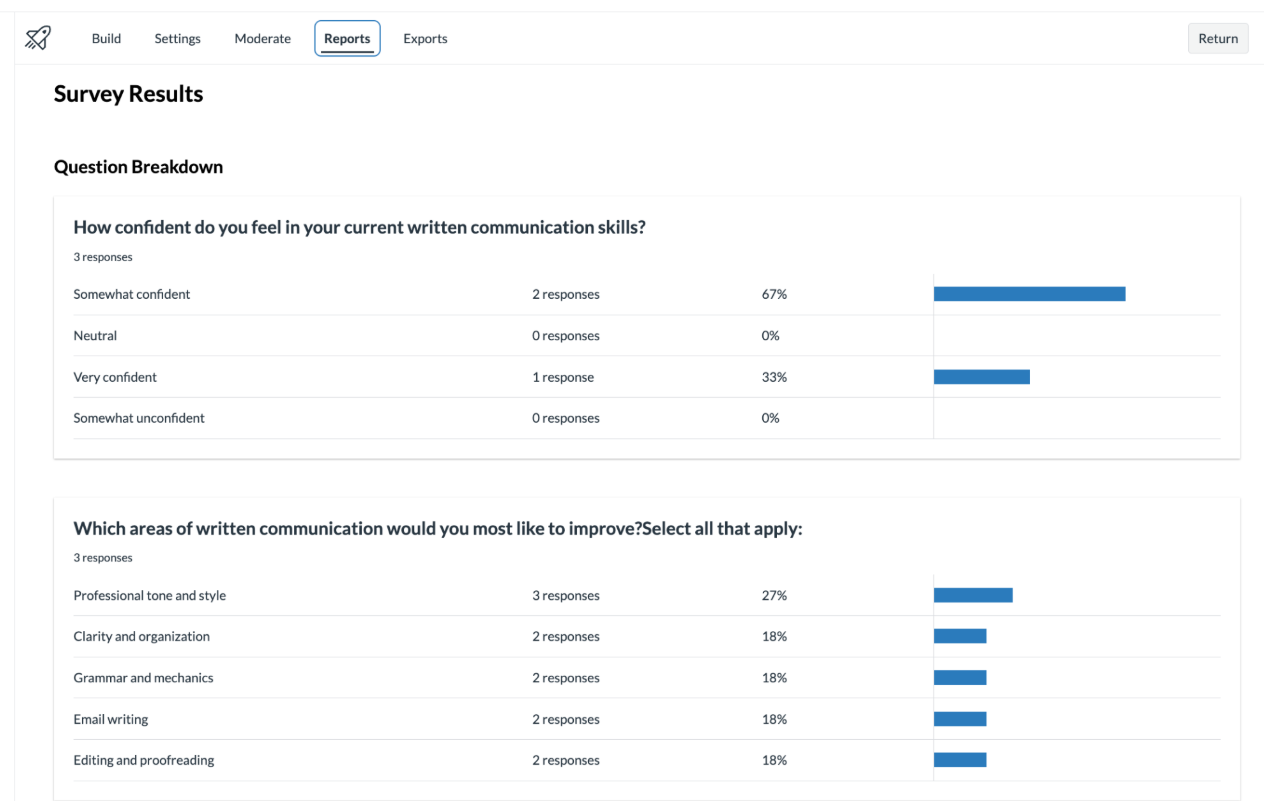 In the Reports tab, instructors can view a breakdown of the results for each question.
