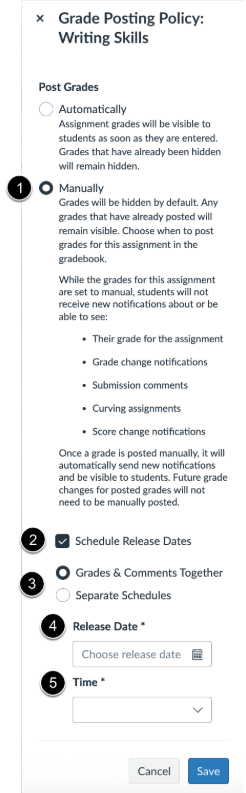 Click the Manually radio button [1], then select the Schedule Release Dates checkbox [2]. Choose whether to release Grades and Comments Together or on Separate Schedules [3], and set the Release Date [4] and Time [5].