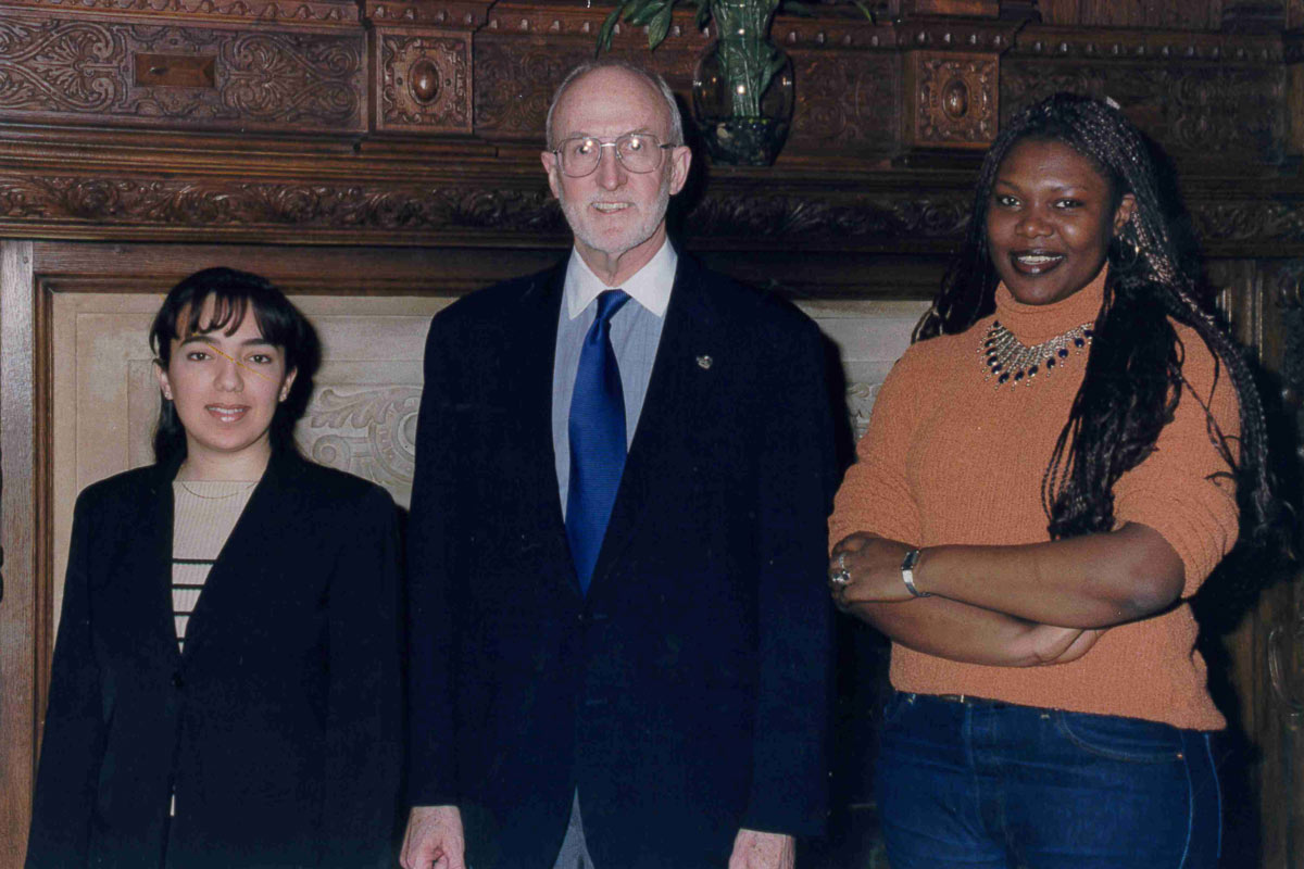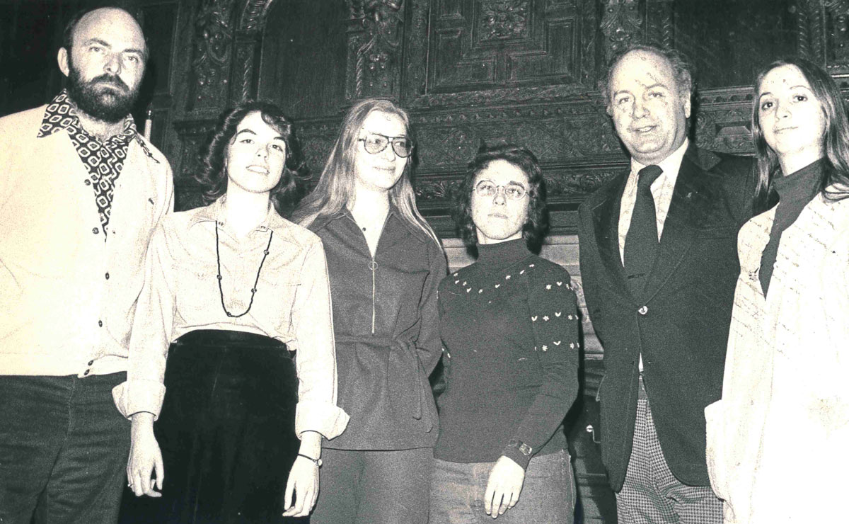 Robert A. Scott, past college president, poses with students and/or faculty.