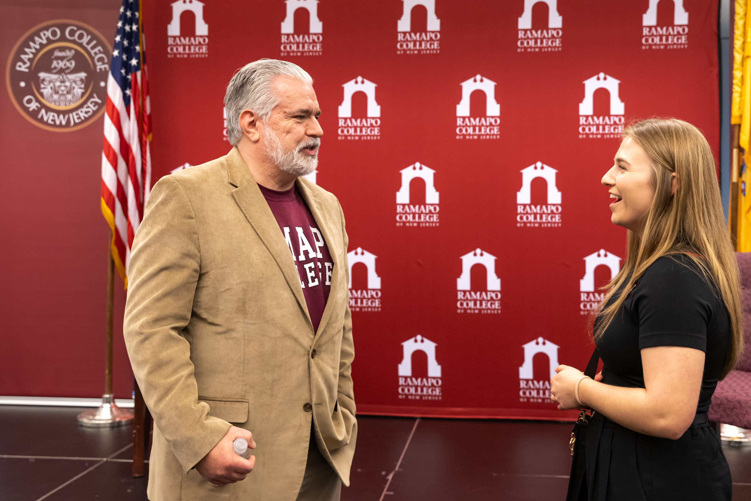 A man in a beige blazer and maroon shirt talks with a smiling woman in black, standing in front of a Ramapo College of New Jersey backdrop, with a U.S. flag and college seal visible.