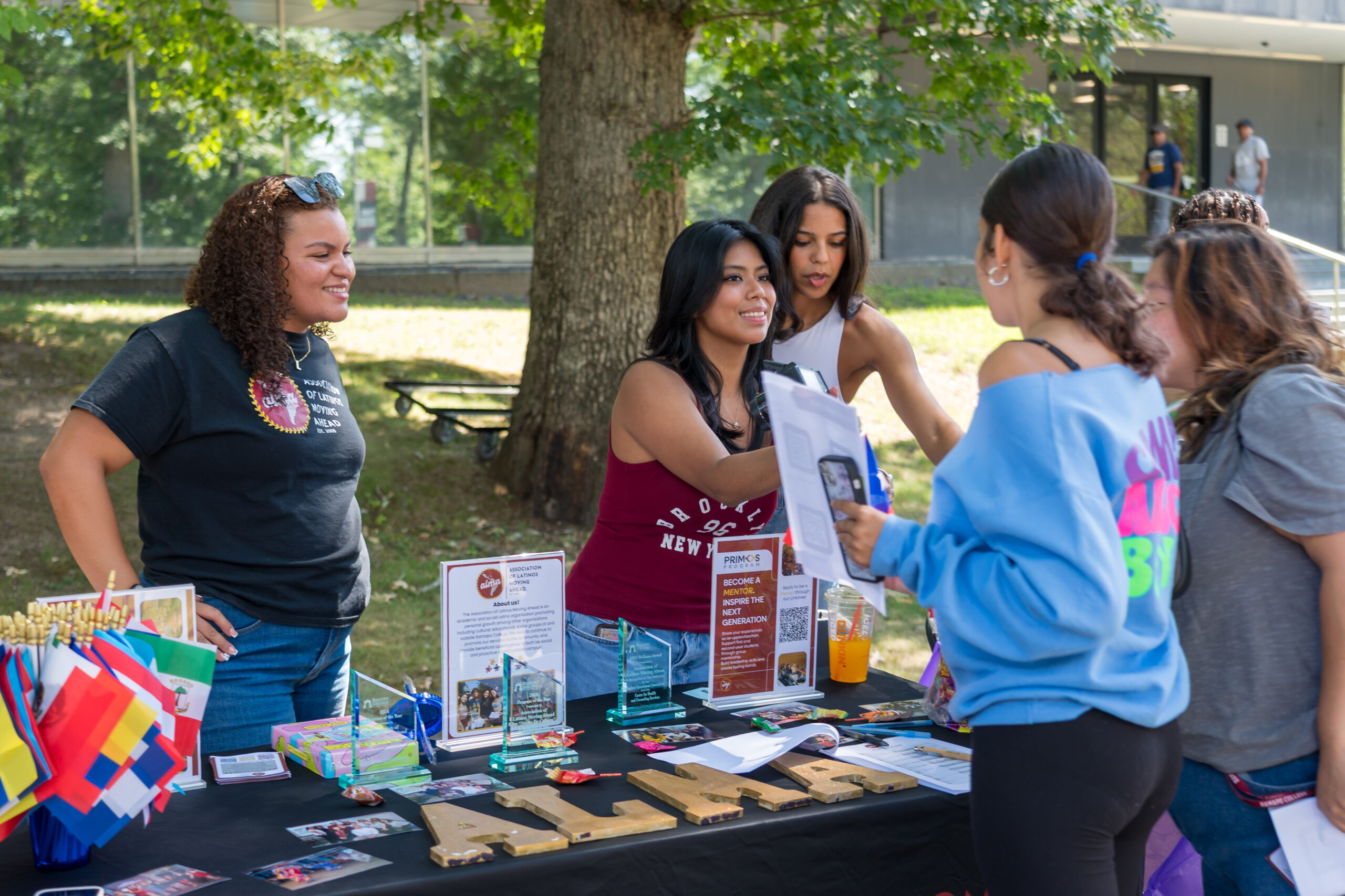 Luannee Hernandez ’26, left, speaks with potential new members of ALMA during Ramapo College’s involvement fair.