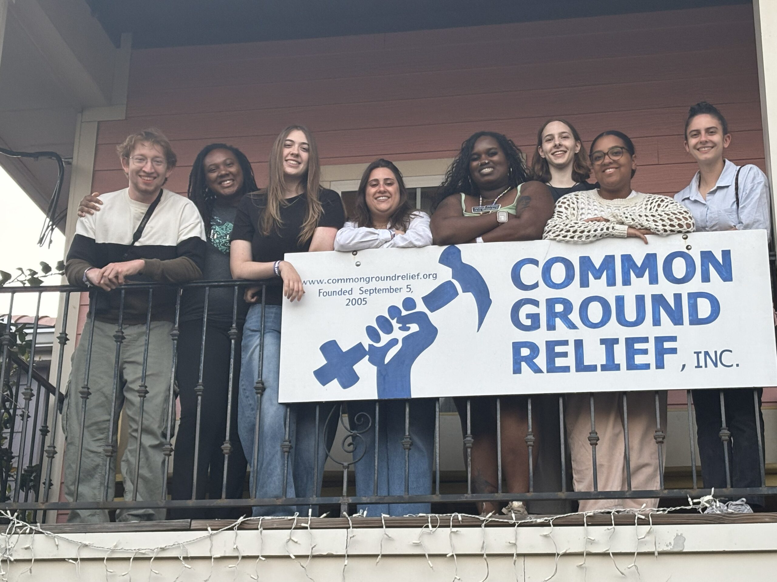 A group of college students stand together behind a banner stating, Common Ground Relief.