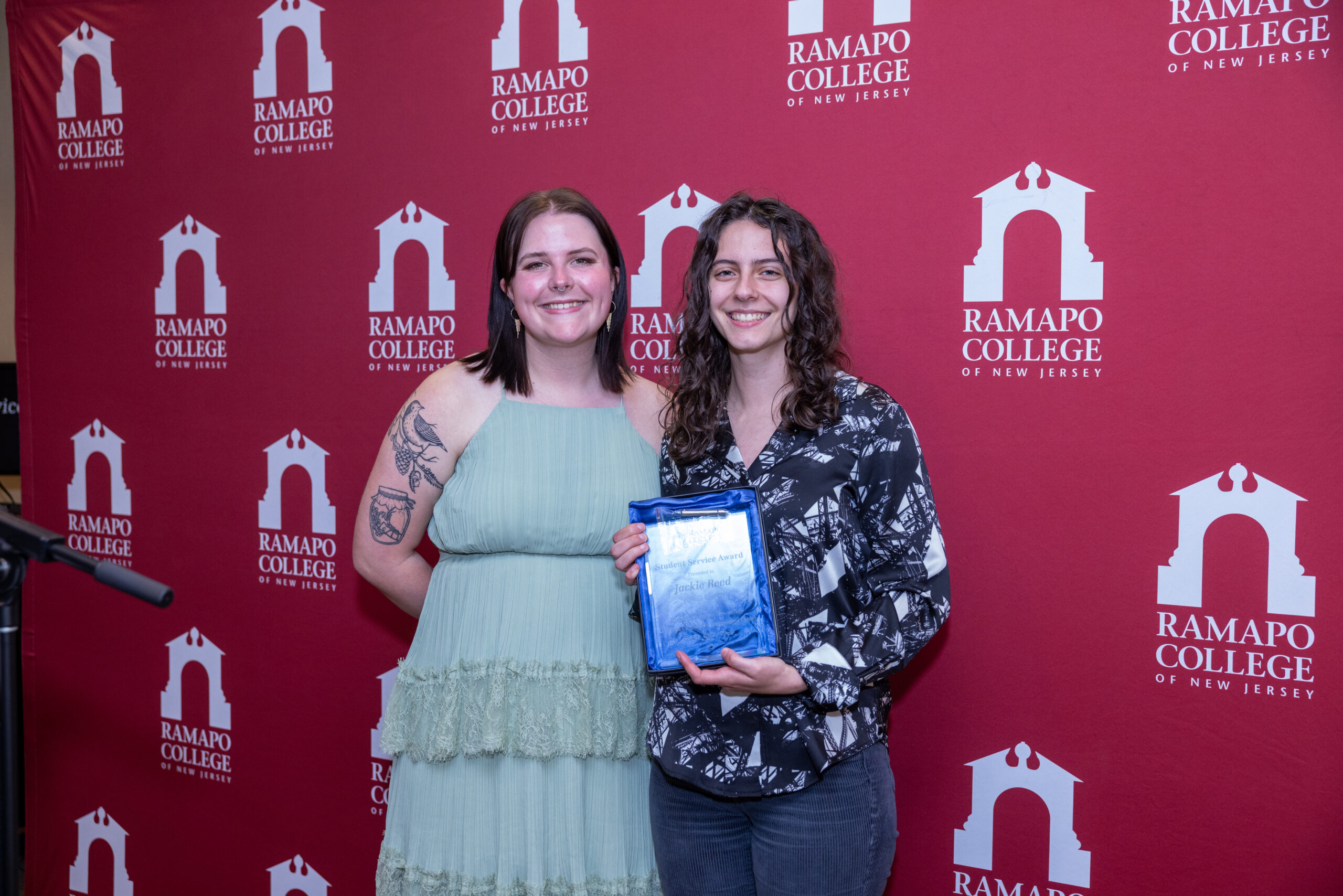 Two women stand in front of a Ramapo College banner. One holds an award.