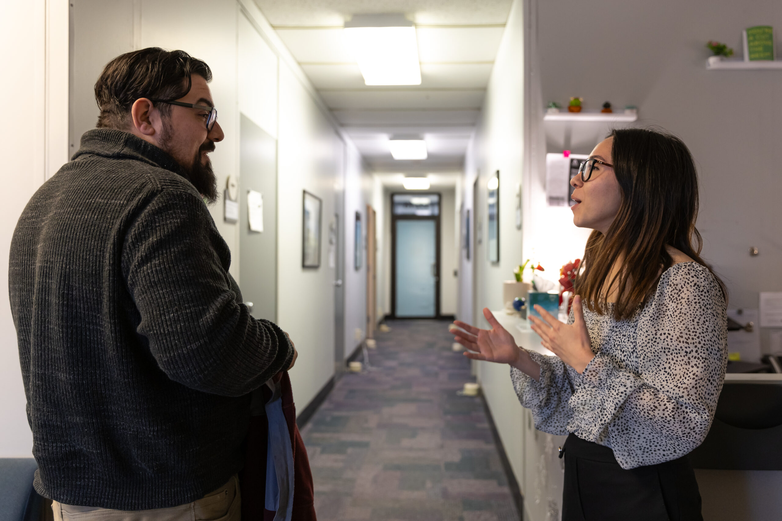 Kirara Fried ’26, right, speaks with Michael Pino, associate director of counseling services at Ramapo. Pino supervises interns in the Psychology Predoctoral Internship Program on campus.