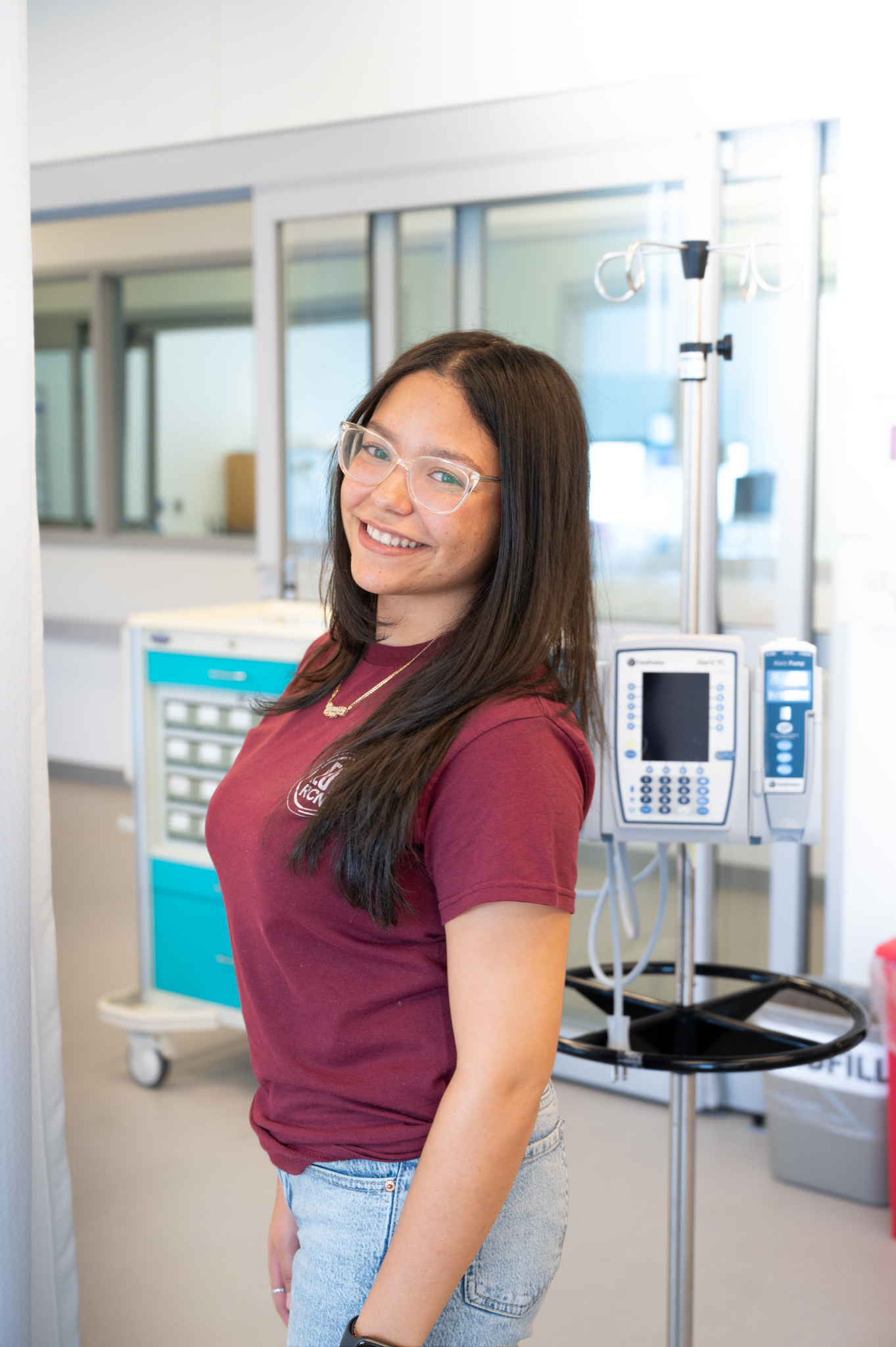 A smiling college student with a maroon shirt stands in front of nursing equipment.