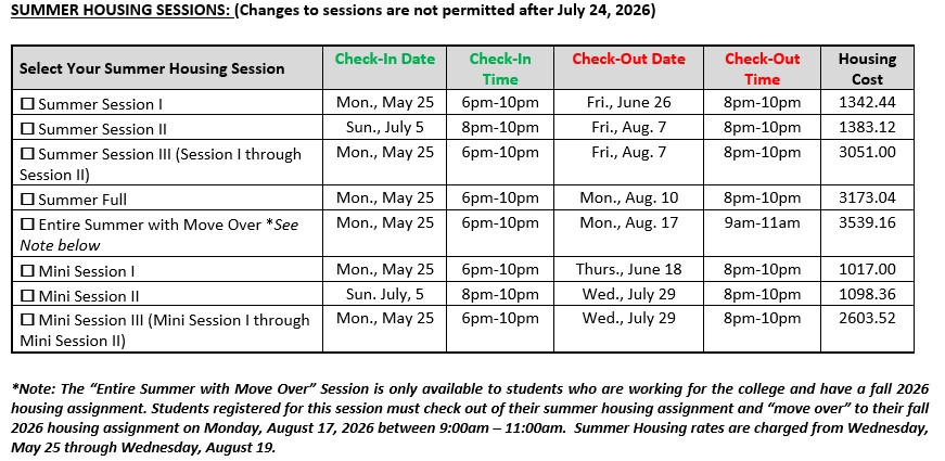 Note: The “Entire Summer with Move Over” Session is only available to students who work for the college that have a Fall 2026 housing assignment. Students registered for the “Entire Summer with Move Over” Session must check out of their summer housing assignment and “move over” into their Fall housing assignment on the date indicated.